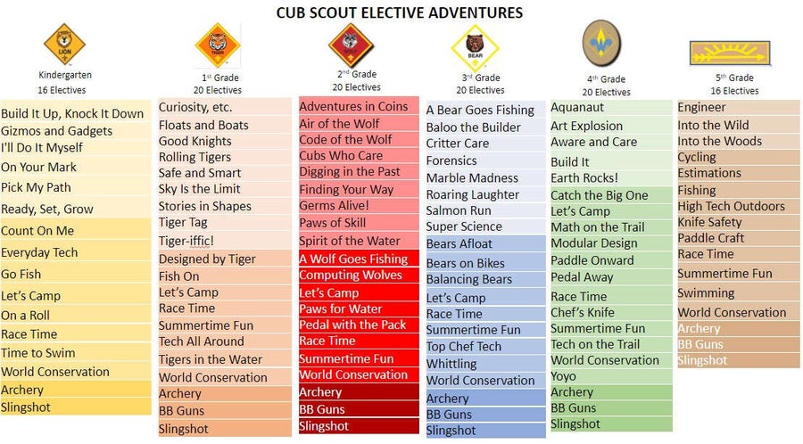 To earn each badge of rank Cub Scouts complete six required Cub Scout Adventures and two elective Cub Scout Adventures. The six required Cub Scout Adventures for each rank are based on the aims and focus areas of the BSA. Character & Leadership, Outdoors, Personal Fitness, Citizenship, Safety, and Family & Reverence